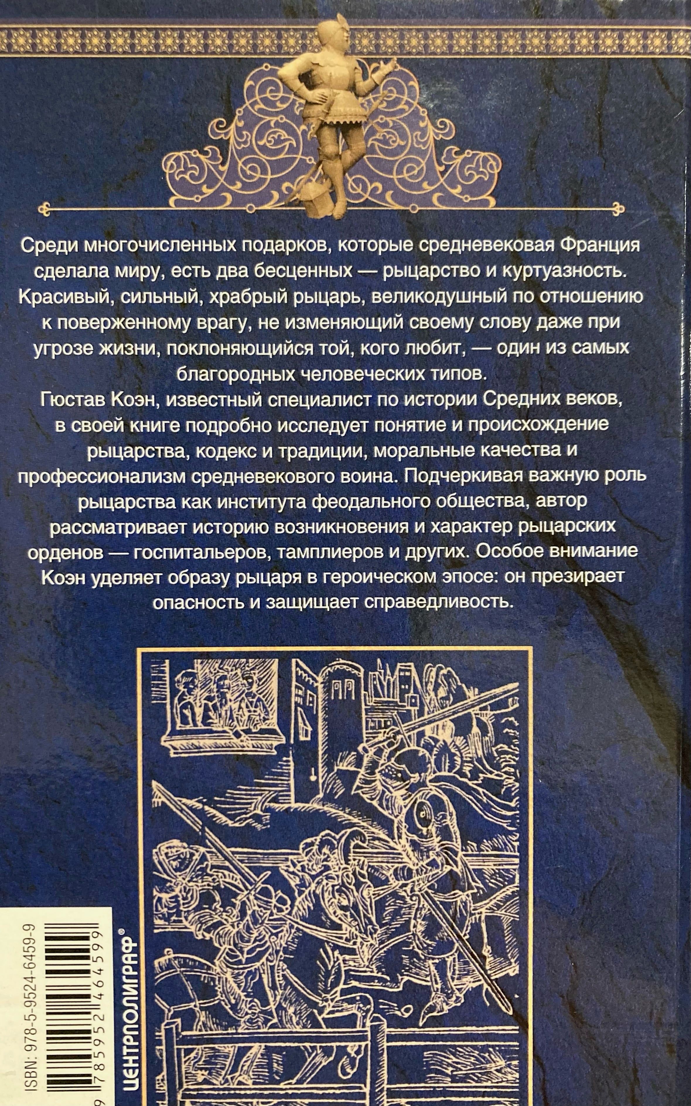 Гюстав Коэн, известный специалист по истории Средних веков, в своей книге подробно исследует понятие и происхождение рыцарства, его кодекс и традиции, моральные качества и профессионализм средневекового воина. Подчеркивая важную роль рыцарства как института феодального общества, автор рассматривает историю возникновения и характер рыцарских орденов — госпитальеров, тамплиеров и других. Особое внимание Коэн уделяет образу рыцаря в героическом эпосе.
