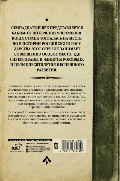 Семнадцатый век представляется каким-то потерянным временем, когда страна топталась на месте, но в истории Российского государства этот отрезок занимает совершенно особое место, где спрессованы и «минуты роковые», и целые десятилетия неспешного развития. Наиболее тугим узлом этой эпохи является Смута. Это поистине страшное и захватывающее зрелище — сопоставимый по масштабу кризис в России повторится лишь триста лет спустя, в начале ХХ века. Там же, в семнадцатом веке, нужно искать корни некоторых острых проблем, которые остаются нерешенными и поныне.