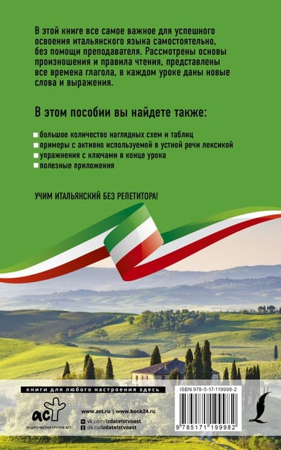 Цель этого самоучителя, включающего 25 уроков — помочь читателю быстро и эффективно освоить итальянский язык. В книге представлена самая важная информация о правильном произношении, основные грамматические темы, даны тексты для чтения. Материал изложен максимально понятно и доступно и прекрасно запоминается благодаря большому количеству наглядных схем, таблиц и примеров с общеупотребительной лексикой.