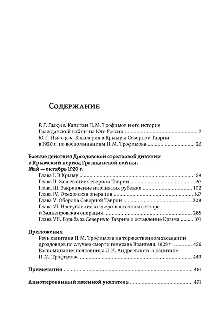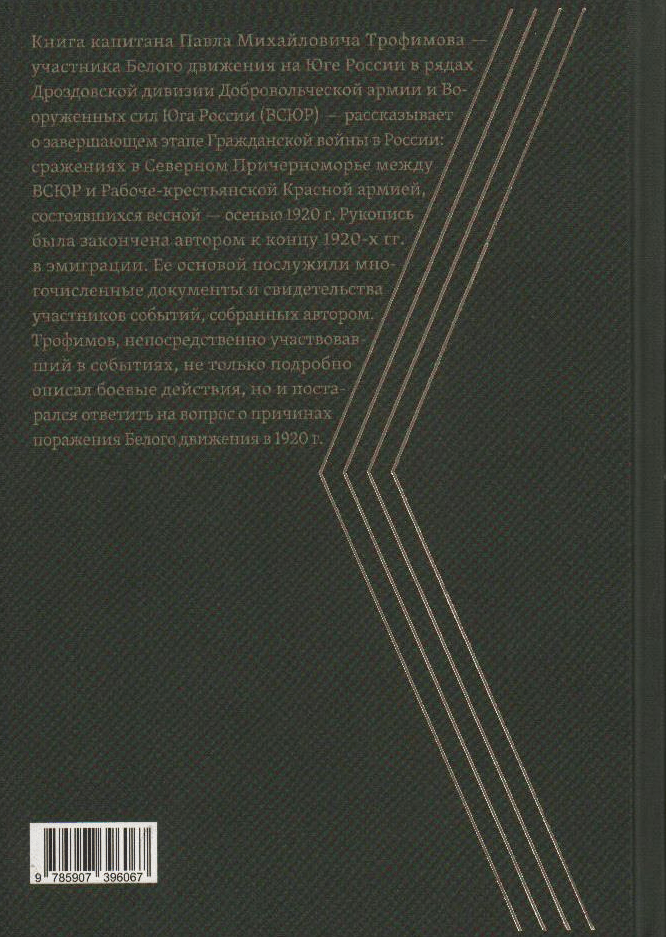Книга капитана Павла Михайловича Трофимова — участника Белого движения на Юге России (ВСЮР) — рассказывает о завершающем этапе Гражданской войны в России: сражениях в Северном Причерноморье между ВСЮР и Рабоче-крестьянской Красной армией, состоявшихся весной — осенью 1920 г. Рукопись была закончена автором к концу 1920-х гг. в эмиграции. Ее основой послужили многочисленные документы и свидетельства участников событий, собранных автором. Трофимов, непосредственно участвовавший в событиях, не только подробно описал боевые действия, но и постарался ответить на вопрос о причинах поражения Белого движения в 1920 г.
