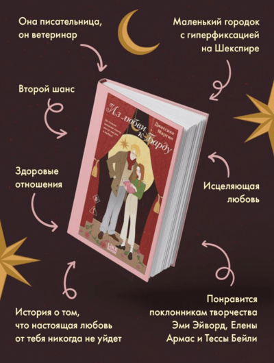 Она писательница, он ветеринар; второй шанс; здоровые отношения; исцеляющая любовь; маленький городок с гиперфиксацией на Шекспире; юмор и очень смешные шутки. «Из любви к Барду» — история о том, что настоящая любовь от тебя никогда не уйдет.