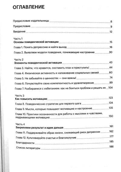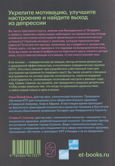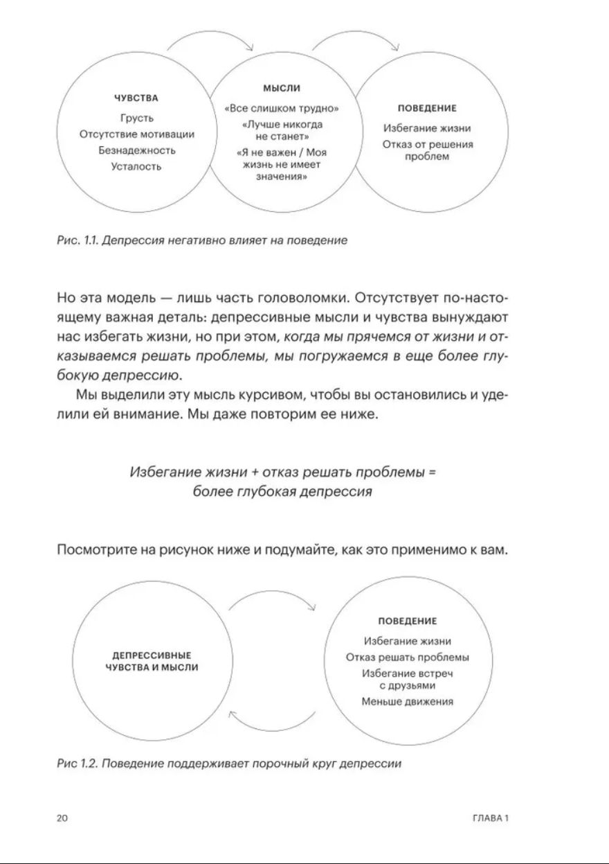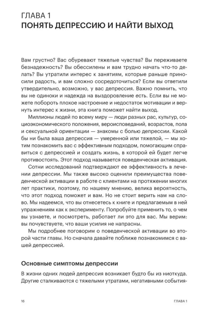 В ее основе — поведенческая активация, метод лечения депрессии с доказанной эффективностью, и когнитивно-поведенческая терапия (КПТ). Эта книга поможет вам разработать собственный план для улучшения настроения (и следовать ему!). Вы также узнаете о мощных инструментах на основе практик осознанности, самосострадания и благодарности, усиливающих позитивный настрой и дающих надежду. Самое главное, вы узнаете, как преодолеть инерцию депрессии, чтобы снова заняться тем, что когда-то приносило удовольствие, и найти новый смысл и цель в жизни.