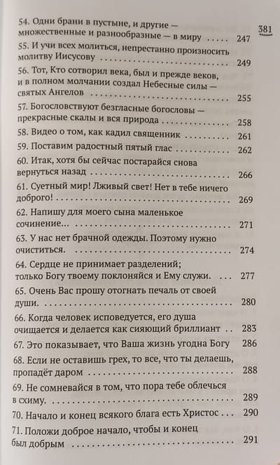 Эта книга — излияние отеческой любви подлинного наставника мирян и монахов, афонского старца преподобного Иосифа Исихаста. Каждый найдет себе в ней спасительное слово. В простых, но глубоких письмах старца открываются истины духовной жизни: почему в жизни человека нет места осуждению, как начать путь умного делания, чего остерегаться на нем; как усовершенствовать душу в повседневной жизни, как хранить мир души. Как приходит к нам благодать Божия, и как ее хранить. Вторую часть книги составляют практические наставления к монаху-исихасту, начавшему отшельническую жизнь.