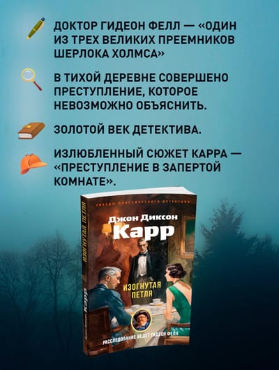 «Изогнутая петля» (1938) повествует об очередном загадочном случае, расследование которого оказывается по плечу только хитроумному доктору Феллу. В тихой деревне Маллингфорд жизнь течет неспешно и размеренно, и каждое происшествие надолго будоражит сельскую общественность. Но странные события в поместье Фарнли, баронета Маллингфорда и Соуна, поистине сделали бы честь и более оживленной местности. Все началось с того, что к Джону Фарнли и его супруге явился незнакомец, назвавшийся… Джоном Фарнли, баронетом Маллингфорда и Соуна…
