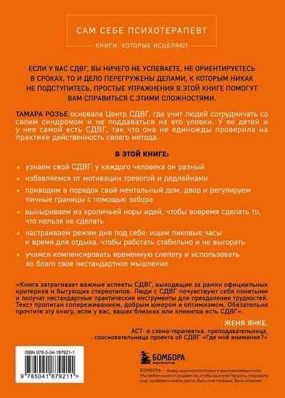 Смягчите проявления СДВГ с помощью авторского метода психотерапевта Тамары Розье. На примерах реальных клиентов из практики автора вы увидите, что СДВГ у всех проявляется по-разному и не всегда в точности соответствует официальным критериям. Вы увидите плюсы и минусы, которые дает вам СДВГ, и работая по авторской методике со своим воображением и убеждениями, измените свое отношение к нему.
