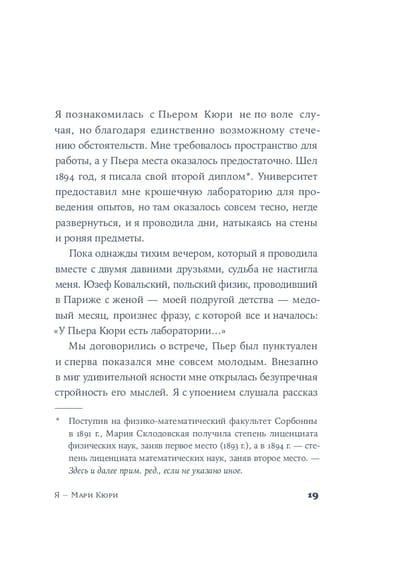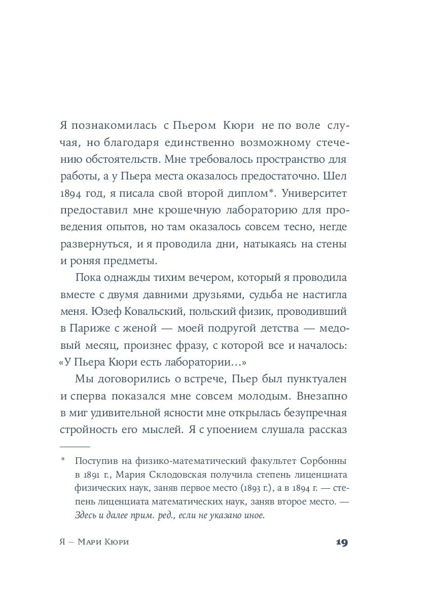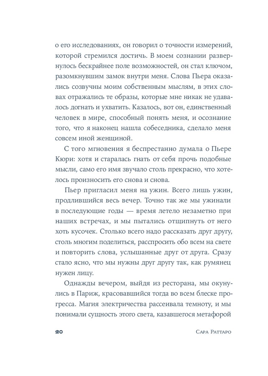 Сара Раттаро дает слово самой ученой. Страницы романа — словно ее дневник, полный сокровенных мыслей и надежд. Мари проходит долгий и тернистый путь от подпольного университета до получения двух Нобелевских премий, сталкиваясь с гендерными предрассудками и преодолевая последствия публичных скандалов. Она разрушает стереотипы — как в науке, так и в жизни, — оставаясь искренней, невероятно смелой и упорной. «Я — Мари Кюри» — история женского гения в мужском мире.