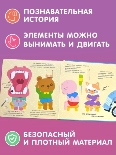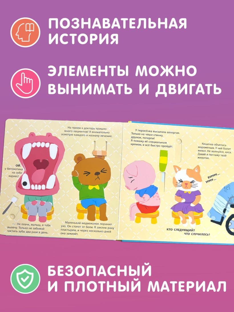 Хочешь лечить зверят, как настоящий доктор? Тогда открывай книжку-игрушку, бери разложенные на страничках медицинские инструменты и принимайся за дело!