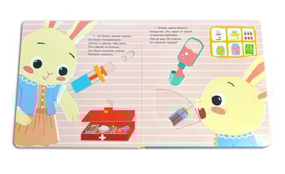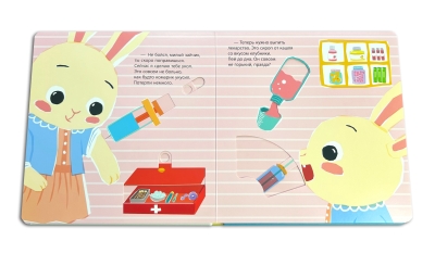 Маленький зайчик заболел. Измерь ему температуру, сделай укол, рентген и ингаляцию, напои лекарством и уложи малыша спать. Все необходимые процедуры ты сможешь выполнить прямо в этой книжке, благодаря подвижным элементам!