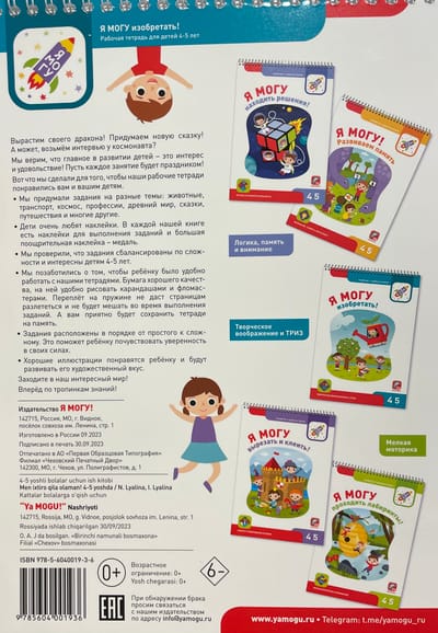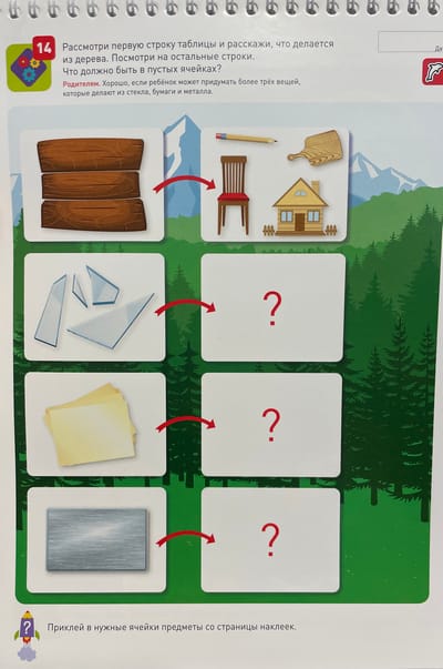 В тетради есть лист с 53 наклейками, которые так нравятся детям. Заламинированные многоразовые наклейки можно переклеивать, не боясь их порвать. Пособия серии «Я могу!» напечатаны на специально подобранной плотной бумаге, с которой ребёнку будет удобно работать. Все тетради имеют переплёт на пружине, который не даст страницам разлететься и не будет мешать во время выполнения заданий.