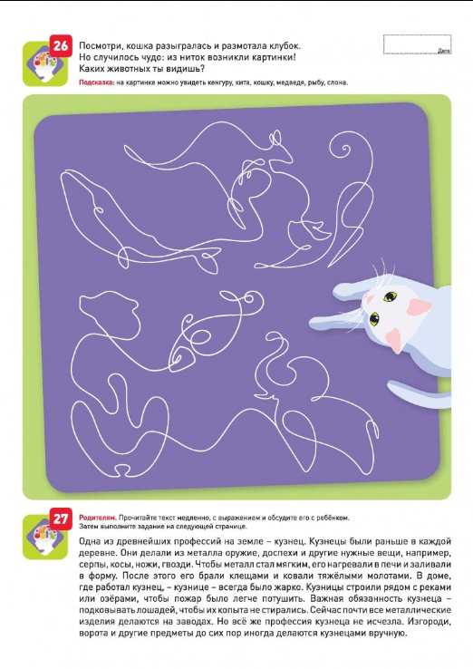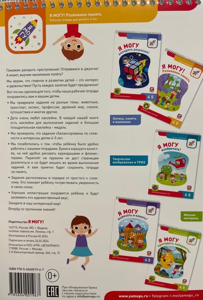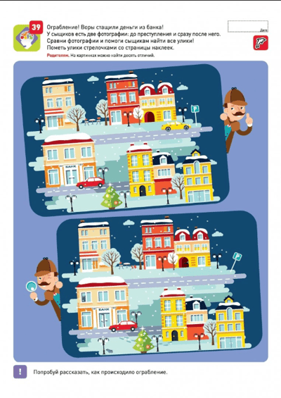 Кроме того, мы будем тренировать зрительную, слуховую и двигательную память. Задания на запоминание чередуются с заданиями на развитие внимания. Упражнения очень разнообразны, например, ребёнку нужно будет найти ошибки, отличия и спрятанные предметы.