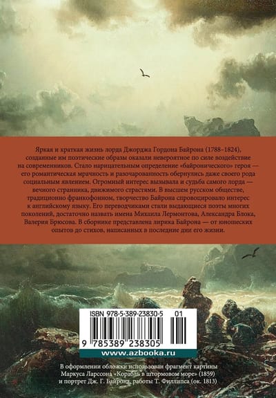 Яркая и краткая жизнь лорда Джорджа Гордона Байрона (1788–1824), созданные им поэтические образы оказали невероятное по силе воздействие на современников. Стало нарицательным определение «байронического» героя — его романтическая мрачность и разочарованность обернулись даже своего рода социальным явлением. Огромный интерес вызывала и судьба самого лорда — вечного странника, движимого страстями. В высшем русском обществе, традиционно франкофонном, творчество Байрона спровоцировало интерес к английскому языку. Его переводчиками стали выдающиеся поэты многих поколений, достаточно назвать имена Михаила Лермонтова, Александра Блока, Валерия Брюсова. В сборнике представлена лирика Байрона — от юношеских опытов до стихов, написанных в последние дни его жизни.