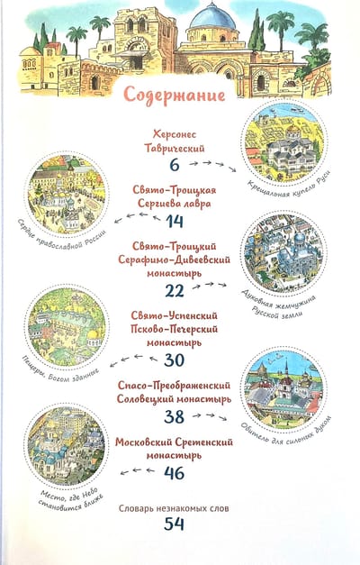 Эта красочно иллюстрированная книга подробно и увлекательно рассказывает о шести святых местах России. Она поможет объяснить детям, что такое паломничество, познакомит их с многовековой историей, архитектурными памятниками и святынями Херсонеса, Троице-Сергиевой лавры, Дивеевской обители, Соловков, Псково-Печерского и Московского Сретенского монастырей. Дети также узнают о многих угодниках Божиих – от святых первых веков христианства до новомучеников и старцев XX века.
