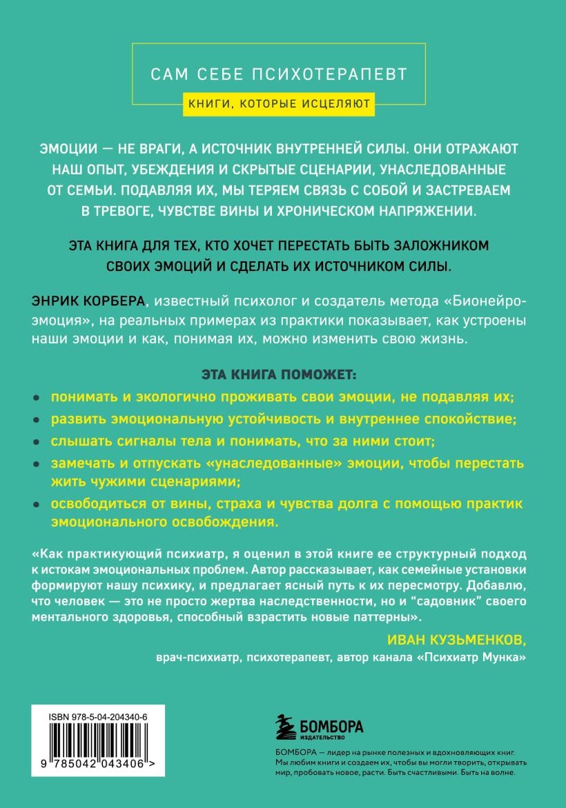 Энрик Корбера, известный психолог и создатель метода «Бионейроэмоция», на основе современных исследований нейропсихологии, эпигенетики и психотерапии, а также реальных историй из психологической практики, показывает, как понимать и экологично проживать свои эмоции. В книге содержатся конкретные шаги для распознавания сигналов тела и психики, выявления бессознательных установок и родовых сценариев.