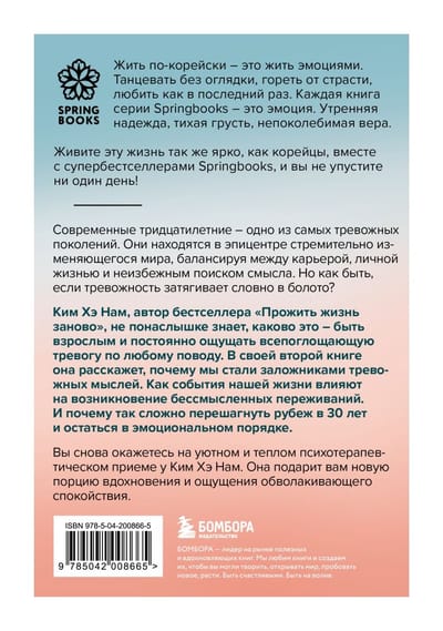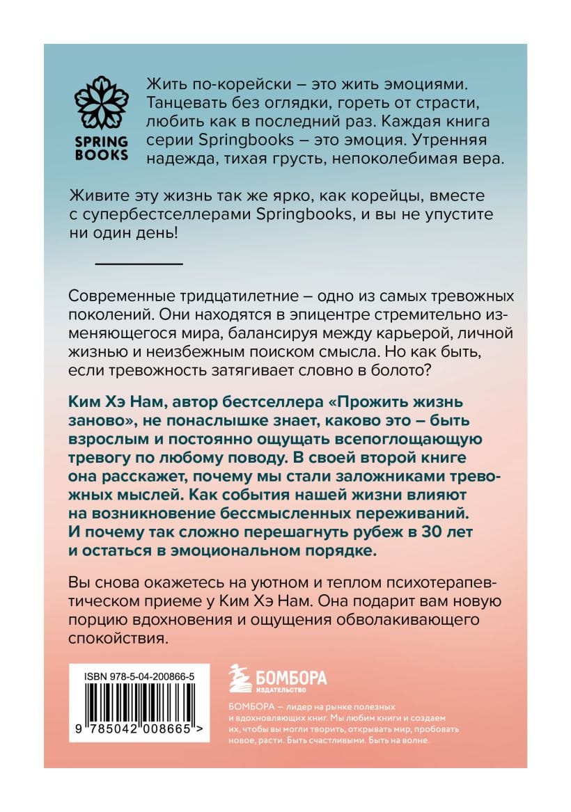 Ким Хэ Нам, автор бестселлера «Прожить жизнь заново», не понаслышке знает, каково это — быть взрослым и постоянно ощущать всепоглощающую тревогу по любому поводу. В своей второй книге она расскажет, почему мы стали заложниками тревожных мыслей. Как события нашей жизни влияют на возникновение бессмысленных переживаний. И почему так сложно перешагнуть рубеж в 30 лет и остаться в эмоциональном порядке.