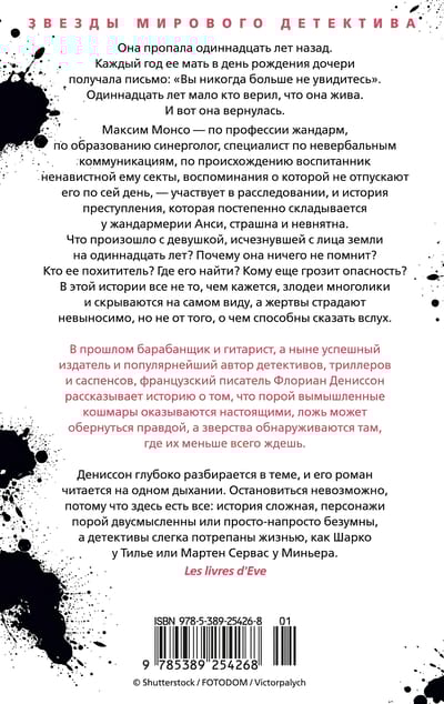Максим Монсо — по профессии жандарм, по образованию синерголог, специалист по невербальным коммуникациям, по происхождению воспитанник ненавистной ему секты, воспоминания о которой не отпускают его по сей день, — участвует в расследовании, и история преступления, которая постепенно складывается у жандармерии Анси, страшна и невнятна. Что произошло с девушкой, исчезнувшей с лица земли на одиннадцать лет? Почему она ничего не помнит? Кто ее похититель? Где его найти? Кому еще грозит опасность? В этой истории все не то, чем кажется, злодеи многолики и скрываются на самом виду, а жертвы страдают невыносимо, но не от того, о чем способны сказать вслух.