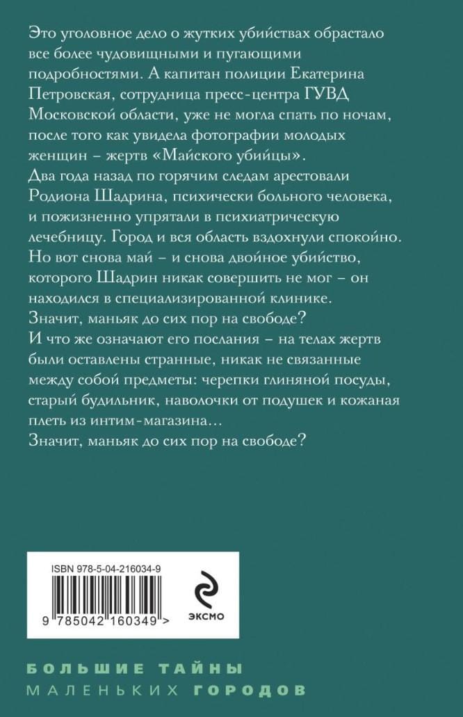 Это уголовное дело о жутких убийствах обрастало все более чудовищными и пугающими подробностями. А капитан полиции Екатерина Петровская, сотрудница Пресс-центра ГУВД Московской области, уже не могла спать по ночам — после того, как увидела фотографии молодых женщин — жертв «Майского убийцы». Два года назад по горячим следам арестовали Родиона Шадрина, психически больного человека, и пожизненно упрятали в психиатрическую лечебницу. Город и вся область вздохнули спокойно. Но вот снова май — и снова двойное убийство, которого Шадрин никак совершить не мог, — он находился в специализированной клинике. Значит, маньяк до сих пор на свободе? И что же означают его послания — на телах жертв были оставлены странные, никак не связанные между собой предметы: черепки глиняной посуды, старый будильник, наволочки от подушек и кожаная плеть из интим-магазина...