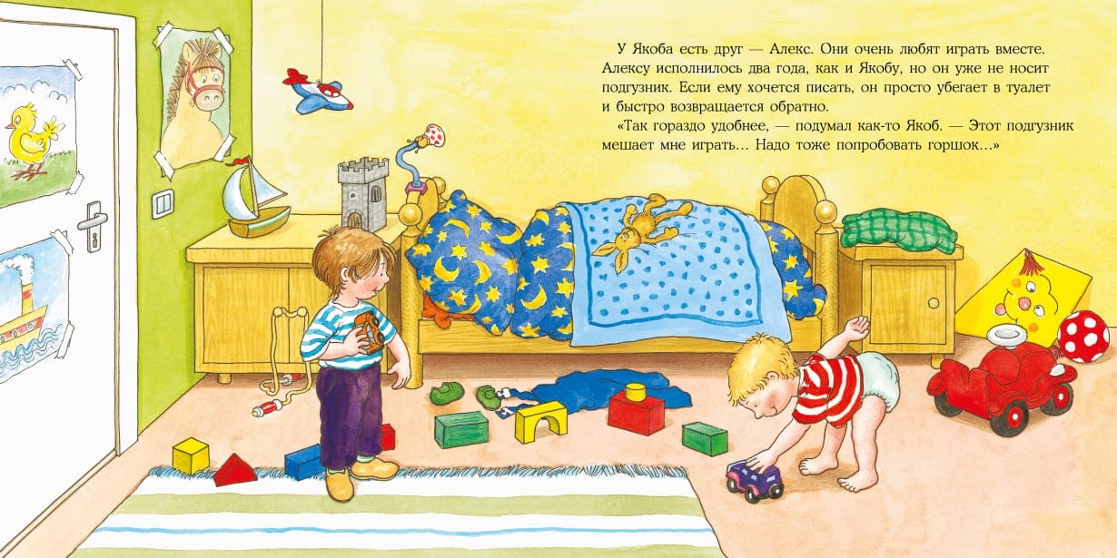Если вашему малышу исполнилось полтора года, вы наверняка уже задумывались о том, что пора его научить пользоваться горшком (или сразу туалетом!). Поздравляем! Сейчас самое подходящее время. А история Якоба, который решил, что он уже достаточно большой, чтобы отказаться от подгузников, вам в этом поможет. Вместе с Якобом ваш малыш поймёт, хочет ли он начать пользоваться горшком, разберётся, как это надо делать, и выйдет на новый уровень самостоятельности. Подходит для совместного чтения с детьми от 2 лет и старше.