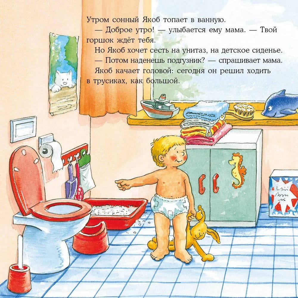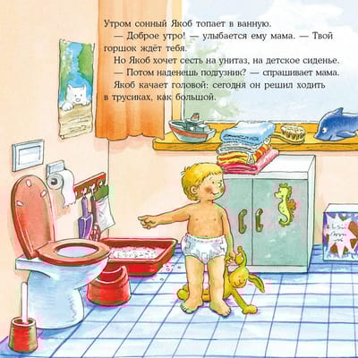 Переходный период, когда ребёнок уже не хочет носить подгузники, но ещё не научился контролировать себя и вовремя идти в туалет, бывает непростым. Вместе с Якобом ваш малыш научится пользоваться туалетом по-взрослому и поймёт, как важно прислушиваться к своему телу и вовремя останавливать игру.