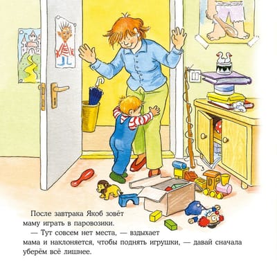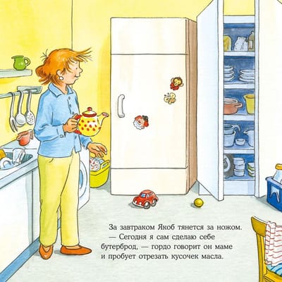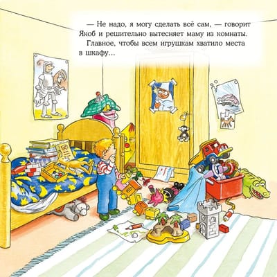 Якоб считает, что он уже большой и может делать всё сам: и порядок в комнате навести, и завтрак себе сделать, и даже вместо мамы купить всё необходимое в магазине. Правда, сказку на ночь никто лучше родителей рассказать не может. Эта история про самостоятельность поможет вашему малышу поверить в свои силы и стать более решительным, а вам, родители, вспомнить, что в этот период очень важно поддерживать и вдохновлять детей во всех их делах.