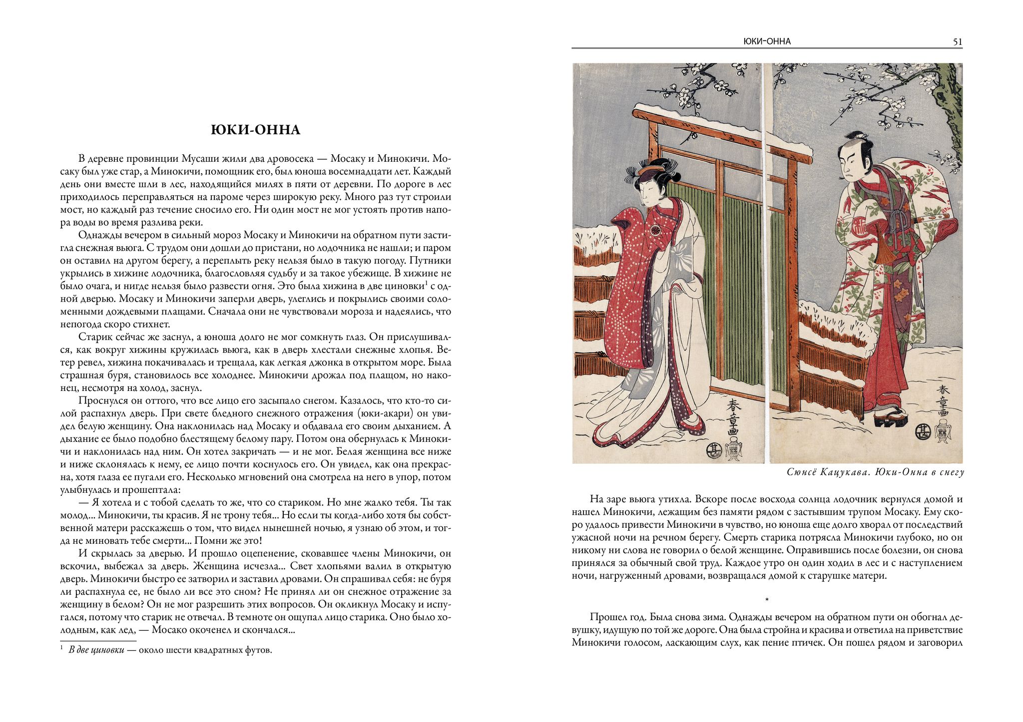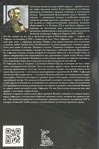 Сборник включает так называемые кайданы — старинные таинственные, «роковые» японские притчи и сказки. Они были любовно собраны под одной обложкой в начале XX века американцем британского происхождения Лафкадио Херном. Последние годы своей жизни он провел в Японии, искренне полюбив старинный дух этой страны. Произведения сборника проиллюстрированы великолепными цветными рисунками японских художников XIX века. Знакомство с японскими кайданами не только развлекает читателя, но и позволяет лучше понять уникальную культуру этой страны. Глубинная основа культуры любого народа — древние легенды, мифы, предания, сказки. В них отражаются его обычаи, верования, отношение к природе, этические и эстетические взгляды. Традиционный фольклорный жанр в Японии — кайданы — диковинные легенды о необычных суевериях, страшные роковые рассказы о призраках и чудесах, о встречах человека со сверхъестественным: демонами, ведьмами, оборотнями и т. п. В начале XX в. они были собраны и переведены на английский язык ирландско-американским прозаиком, переводчиком и востоковедом, специалистом по японской литературе Лафкадио Херном (1850–1904). Он был назван так же, как и греческий остров в Ионическом море — Лефкас, или Лефкада, на котором в 1850 г. появился на свет. Отец Лафкадио — ирландец, военный врач, мать — коренная гречанка. Первые годы жизни мальчика под солнечным лазурным небом Греции были безоблачными. А потом разразилась семейная драма. Отец увез семью в Англию. Пейзажи и климат Туманного Альбиона подействовали на мать мальчика угнетающе, и вскоре она вернулась в любимую Грецию. Брак распался. Лафкадио остался с отцом, который не слишком заботился о воспитании сына, до своего совершеннолетия находившегося под присмотром старой тетки. Распад семьи стал трагедией для юноши. Возможно, в этом таилась причина его страсти к мистике, к потустороннему миру, ведь в реальности не было ни радости, ни счастья. И Лафкадио уехал в Америку. Солнечный Новый Орлеан, в котором он осел, напоминал жизнерадостную Грецию. Здесь воспрял духом и начал писать веселые фельетоны, приводившее в восторг местных жителей. Однако счастливый период в его жизни был недолгим — его сменили разочарования и одиночество. В 1890 г. Лафкадио убегает от себя на край земли — в далекую Японию, работает там американским корреспондентом. Писатель восторгается древним духом этой страны, столь близкой его романтической натуре. Он увлекается буддийской культурой, посещает старинные монастыри, жадно вслушивается, всматривается в страшные истории о сверхъестественном. Но противоречия между рациональным настоящим и древней, таинственной Японией не давали покоя мечущийся душе Лафкадио. Он как будто всегда находился меж двух миров — реальным и ирреальным. Желание сохранить уникальный образ Древней Японии, показать его людям подтолкнуло Лафкадио к составлению сборника кайданов, книги, которую вы держите в руках. Она проиллюстрирована утонченными гравюрами японских художников XIX в., которые позволяют глубже понять и почувствовать эту богатую красками страну.