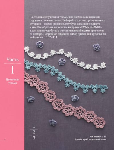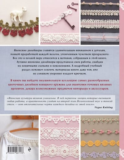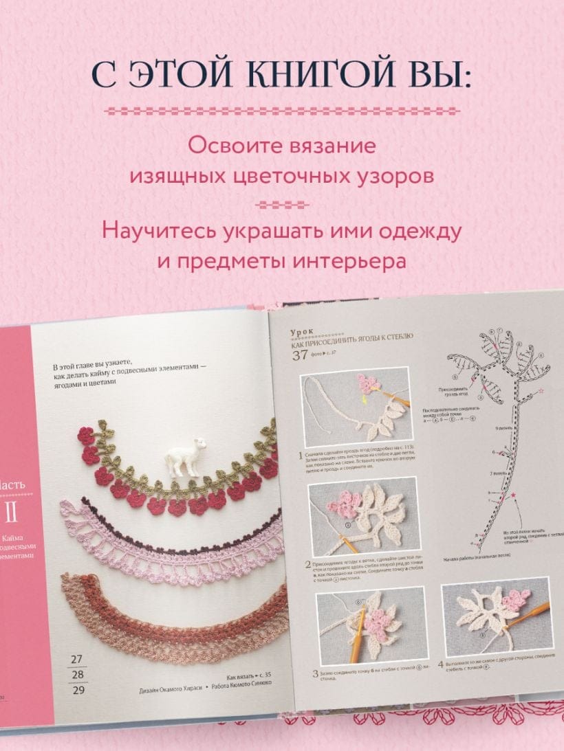 Изысканные бордюры, края и окантовки от лучших японских мастеров с четкими и понятными схемами, удивительными иллюстрациями, примерами использования для декора одежды, изготовления аксессуаров, оформления предметов интерьера или подарочной упаковки, излюбленные в японской традиции цветочные мотивы, удивительное разнообразие, от геометрии до фантазийных композиций, от снежно-белых до пастельных или ярких оттенков.