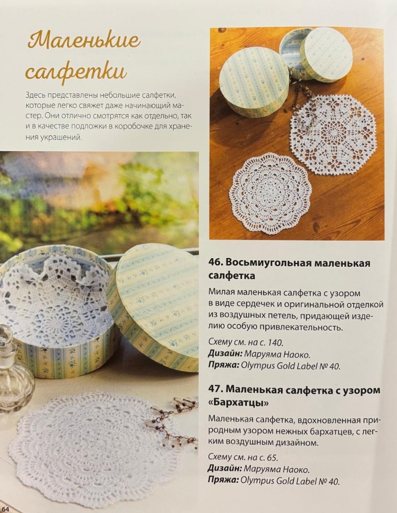 Вас ждет 45 уникальных дизайнов от лучших японских мастеров, сочетающие традиционную гармонию и современные идеи: от лёгких ажурных салфеток до изящных декоративных скатертей, подставок и оригинальных аксессуаров для дома. Каждая схема выполнена в крупном формате, а инструкции даны максимально понятно и подробно, чтобы вязать было легко даже новичкам.