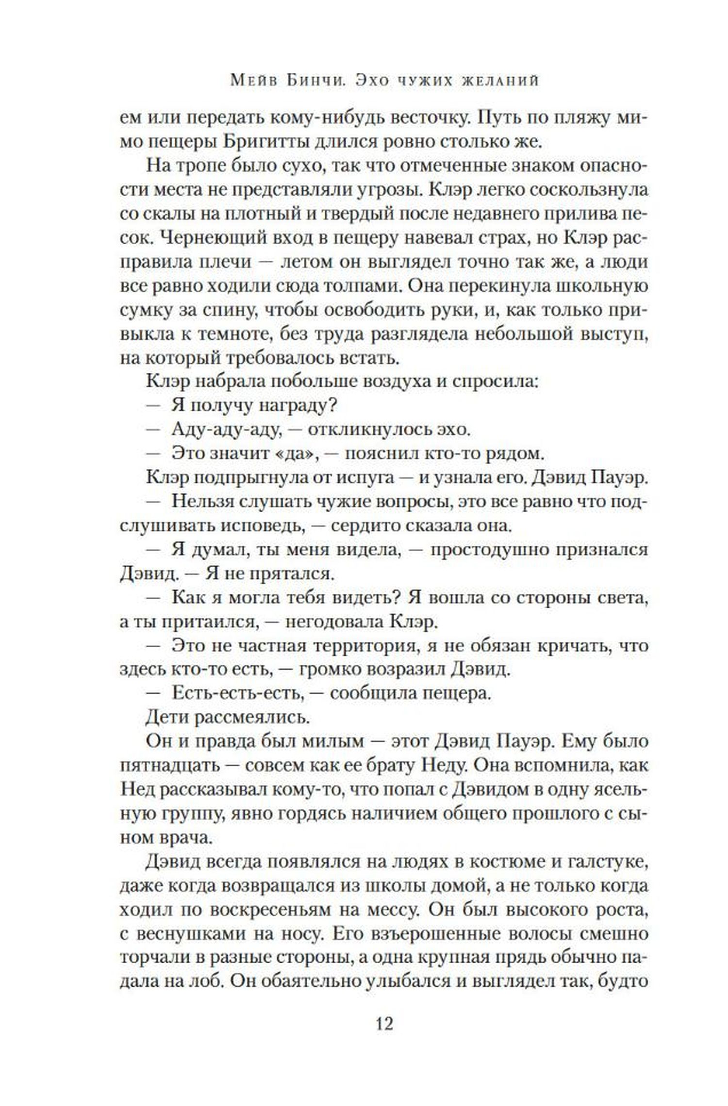 Ирландская писательница и журналистка Мейв Бинчи (1940–2012) хорошо известна не только на своей родине, но и во всем мире. Перу Бинчи, помимо рассказов, принадлежит 16 романов, ее книги неизменно становились бестселлерами и не раз получали престижные международные премии. В 1970-х годах Бинчи опубликовала три сборника рассказов, и довольно успешно, но настоящая слава пришла к ней после выхода первого романа «Зажги свечу» (1982). Через три года увидел свет второй роман Бинчи «Эхо чужих желаний», также встретивший теплый отклик читающей публики. У моря, в окрестностях тихого ирландского поселка Каслбей, в пещере прячется эхо. Люди верят, что, если эху задать вопрос, оно непременно ответит. Однажды сюда приходят двое подростков, Дэвид и Клэр. Мечта у них одинаковая: уехать подальше от родных мест. Мечты сбываются. Клэр выигрывает стипендию в Университетском колледже Дублина и переезжает в столицу. Едет туда и Дэвид, мечтающий стать врачом. Пути их пересекутся самым неожиданным образом и... приведут обратно, в серый пустынный Каслбей, где когда-то на фоне семейных тайн, сплетен и запутанных отношений разыгралась драма амбиций, предательства и любви…