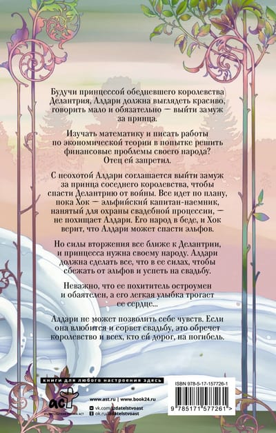 Будучи принцессой обедневшего королевства Делантрия, Алдари должна выглядеть красиво, говорить мало и обязательно — выйти замуж за принца. Изучать математику и писать работы по экономической теории в попытке решить финансовые проблемы своего народа? Отец ей запретил. С неохотой Алдари соглашается выйти замуж за принца соседнего королевства, чтобы спасти Делантрию от войны. Все идет по плану, пока Хок — эльфийский капитан-наемник, нанятый для охраны свадебной процессии, — не похищает Алдари. Его народ в беде, и Хок верит, что Алдари может спасти эльфов. Но силы вторжения все ближе к Делантрии, и принцесса нужна своему народу. Алдари должна сделать все, что в ее силах, чтобы сбежать от эльфов и успеть на свадьбу. Неважно, что ее похититель остроумен и обаятелен, а его легкая улыбка трогает ее сердце... Алдари не может позволить себе чувств. Если она влюбится и сорвет свадьбу, это обречет королевство и всех, кто ей дорог, на погибель.