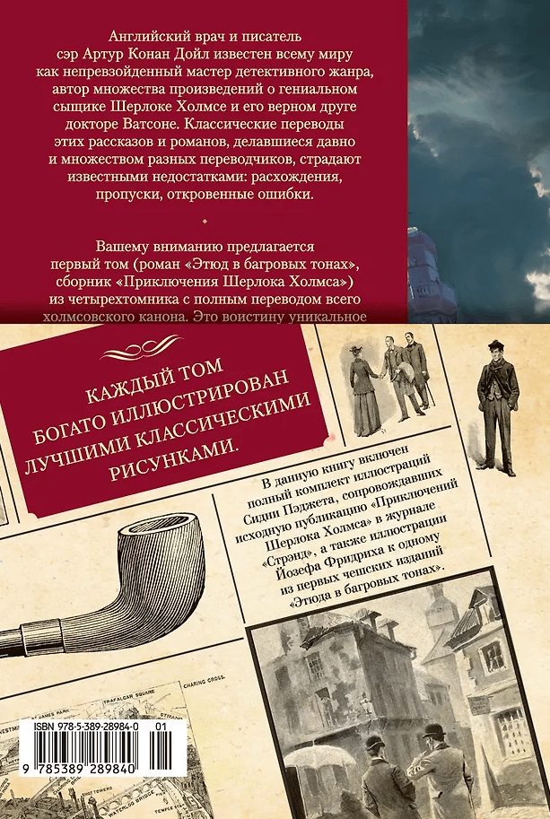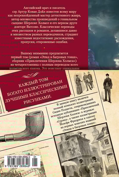 Вашему вниманию предлагается первый том (роман «Этюд в багровых тонах», сборник «Приключения Шерлока Холмса») из четырехтомника с полным переводом всего холмсовского канона. Это воистину уникальное издание: все произведения цикла переведены заново Людмилой Бриловой и Сергеем Сухаревым — мастерами, чьи переводы Кадзуо Исигуро и Рэя Брэдбери, Фрэнсиса Скотта Фицджеральда и Чарльза Паллисера, Томаса Де Квинси, Германа Мелвилла и других давно стали классическими. При этом каждый том снабжен большим числом классических рисунков и дополнительными материалами: предисловия к ранним публикациям, воспоминания Конан Дойла, касающиеся тех или иных произведений, некоторые интервью писателя.