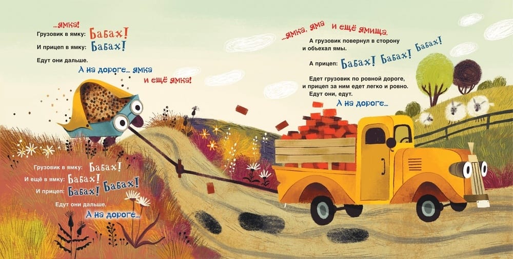 История для самых маленьких о том, как грузовик и его друг непоседливый прицеп трудятся с утра до ночи, развозя разные грузы. В пути их ждут ямки и ямищи, горы и пригорки, и лужи, и дожди... Этак у кого хочешь колесо разболится... Хорошо, что друг всегда придет на помощь в трудную минуту!