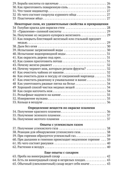 Знаете ли вы, что дым без огня бывает? Сможете ли очистить чайник от накипи? Сумеете вырастить кристаллы из обычной соли? А приготовите сливочные конфеты из молока или сладкий сырок из простокваши? Благодаря этой книге вы научитесь делать это и многое другое. Здесь собраны разнообразные и несложные химические опыты, которые можно безопасно выполнять в быту. Вы познакомитесь с химическими свойствами разных веществ — сахара, углекислого газа, белков и жиров, солей и кислот — и приобретете первоначальные знания о химии, которые обязательно пригодятся в школе. Все опыты описаны доступным языком и дополнены поясняющими пошаговыми иллюстрациями. В начале издания перечислены оборудование и реактивы, которые понадобятся для домашних экспериментов, а также подробные правила обращения со всеми приборами и веществами.