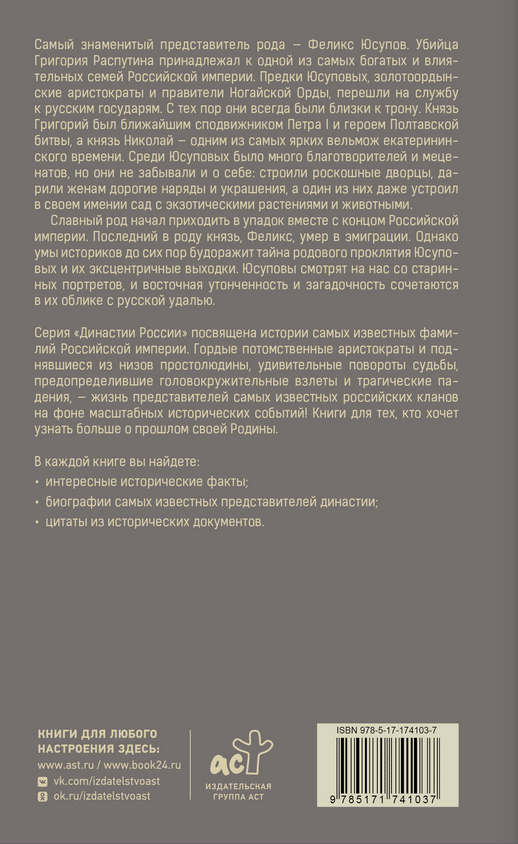Славный род начал приходить в упадок вместе с концом Российской империи. Последний в роду князь, Феликс, умер в эмиграции. Однако умы историков до сих пор будоражит тайна родового проклятия Юсуповых и их эксцентричные выходки. Юсуповы смотрят на нас со старинных портретов, и восточная утонченность и загадочность сочетаются в их облике с русской удалью.
