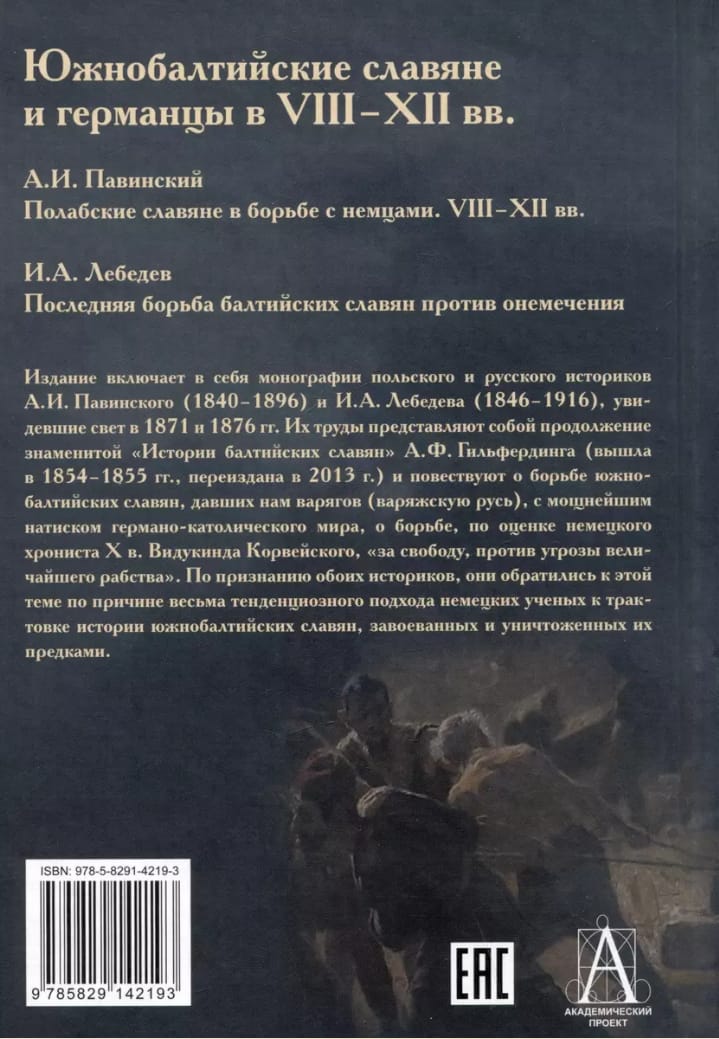 Издание включает в себя монографии польского и русского историков А. И. Павинского (1840-1896) и И. А. Лебедева (1846-1916), увидевшие свет в 1871 и 1876 гг. Их труды представляют собой продолжение знаменитой «‎Истории балтийских славян»‎ А. Ф. Гильфердинга (вышла в 1854-1855 гг., переиздана в 2013 г.) и повествуют о борьбе южнобалтийских славян, давших нам варягов (варяжскую русь), с мощнейшим натиском германо-католического мира, о борьбе, по оценке немецкого хрониста Х в. Видукинда Корвейского, «‎за свободу, против угрозы величайшего рабства»‎.
