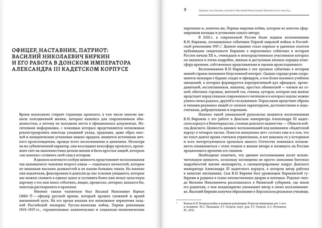 Воспоминания полковника Василия Николаевича Биркина (1880–?) рассказывают о его службе в качестве воспитателя в Донском императора Александра III кадетском корпусе в Новочеркасске в период со второй половины 1908 по лето 1916 г. В воспоминаниях приводятся многочисленные подробности как жизни на Дону, так и службы воспитателем в казачьем корпусе: взаимоотношения между кадетами, воспитателями и преподавателями, между самими кадетами разных возрастов, отличительные особенности учебы кадет в казачьем корпусе, системы воспитания и обучения в военно-учебных заведениях Российской империи и пр. Мемуары заканчиваются возвращением автора на строевую службу и уходом на фронт Первой мировой войны.