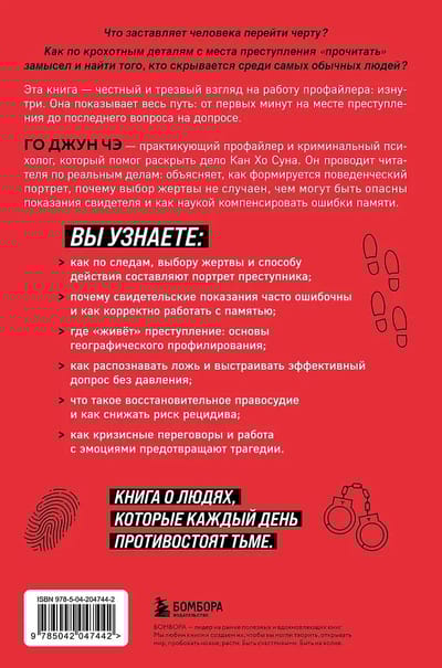 Го Джун Чэ — практикующий профайлер и криминальный психолог, который помог раскрыть дело Кан Хо Суна. Он проводит читателя по реальным делам: объясняет, как формируется поведенческий портрет, почему выбор жертвы не случаен, чем могут быть опасны показания свидетеля и как наукой компенсировать ошибки памяти.