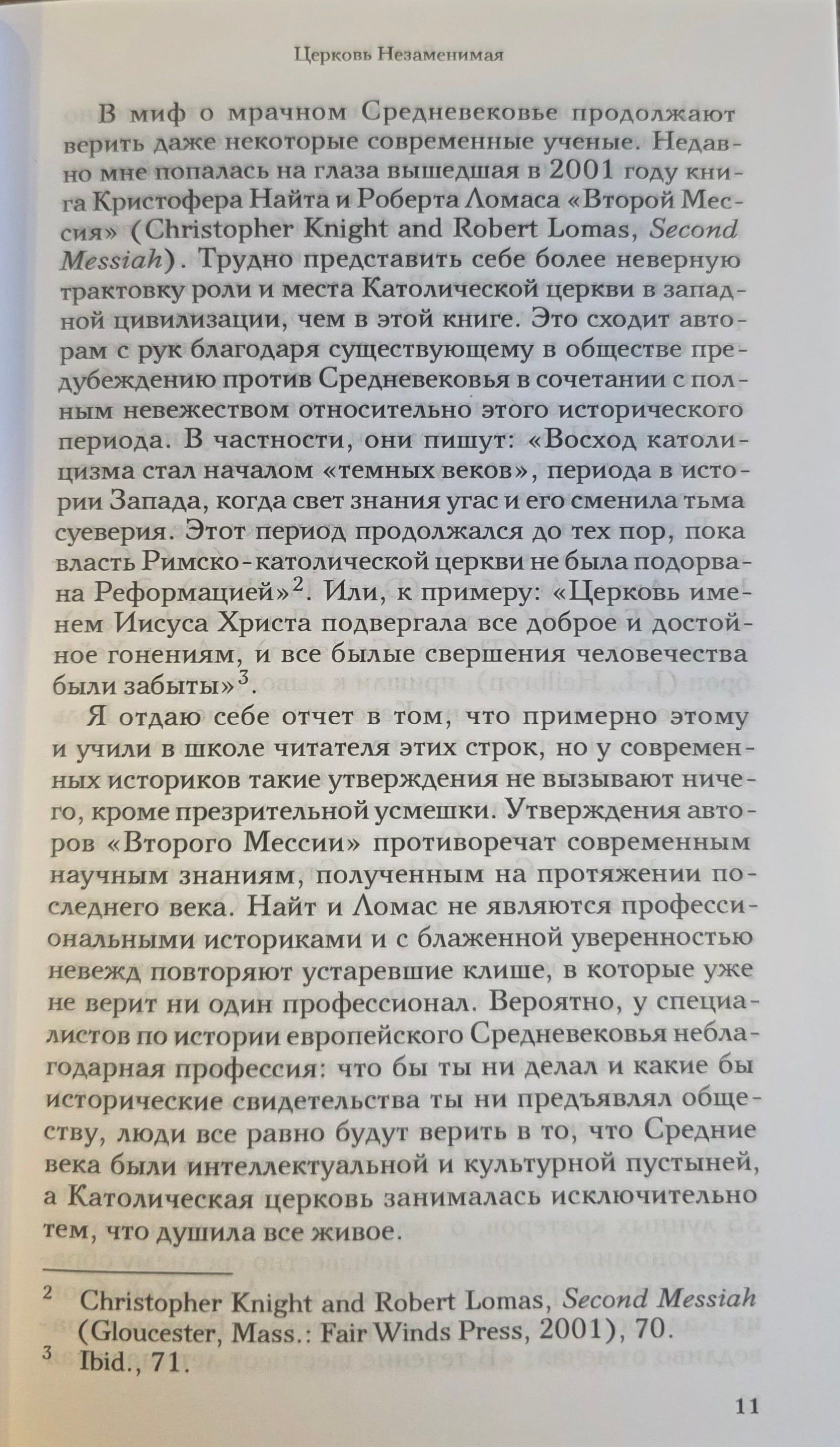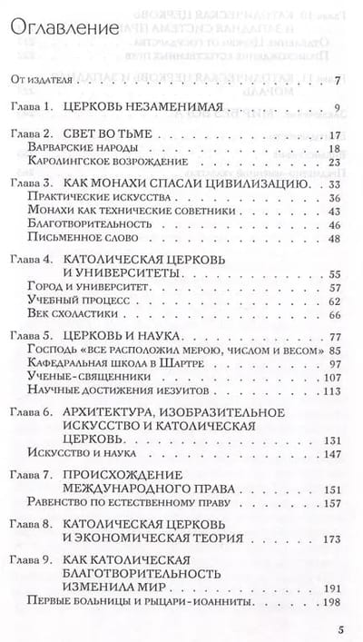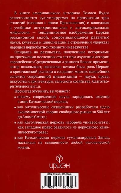 В книге американского историка Томаса Вудса развенчивается культивируемая на протяжении трех столетий (начиная с эпохи Просвещения) и вошедшая в учебники антихристианская и антиклерикальная мифология — тенденциозное изображение Церкви реакционной силой, сопротивляющейся развитию науки, культуры и цивилизации в стремлении удержать народы в первобытной темноте и невежестве.