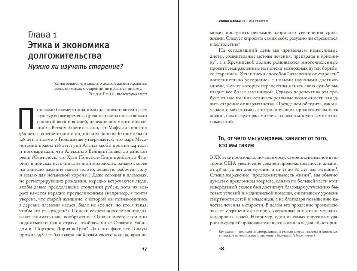 Наше информационное поле переполнено разговорами о старении: как его замедлить, а то и вовсе предотвратить, насколько вообще возможно продлить человеческую жизнь, сумеем ли мы достичь бессмертия и так далее. Найдется все, от научно обоснованных практических советов до научно-фантастических гипотез, — но как определить, что из этого и правда связано с наукой? Биолог Колин Мёрфи, которая преподает в Принстонском университете и сама занимается проблемами старения в своей лаборатории, сочла необходимым честно описать современное положение дел. Она подробно рассказывает, как ученые нащупывают пути к продлению жизни и улучшению ее качества, в каких направлениях проводятся исследования и каким образом можно интерпретировать их результаты. Добросовестная фундаментальная наука никогда не дает простых ответов, зато позволяет смотреть на волнующие нас вопросы реалистично — без розовых очков, но со здоровой долей оптимизма.