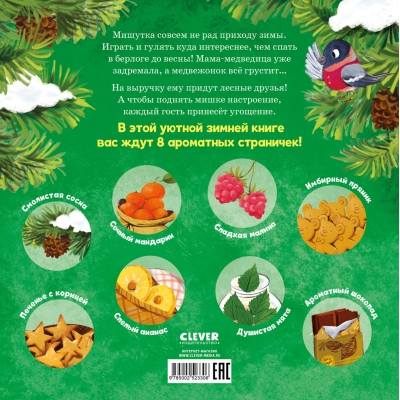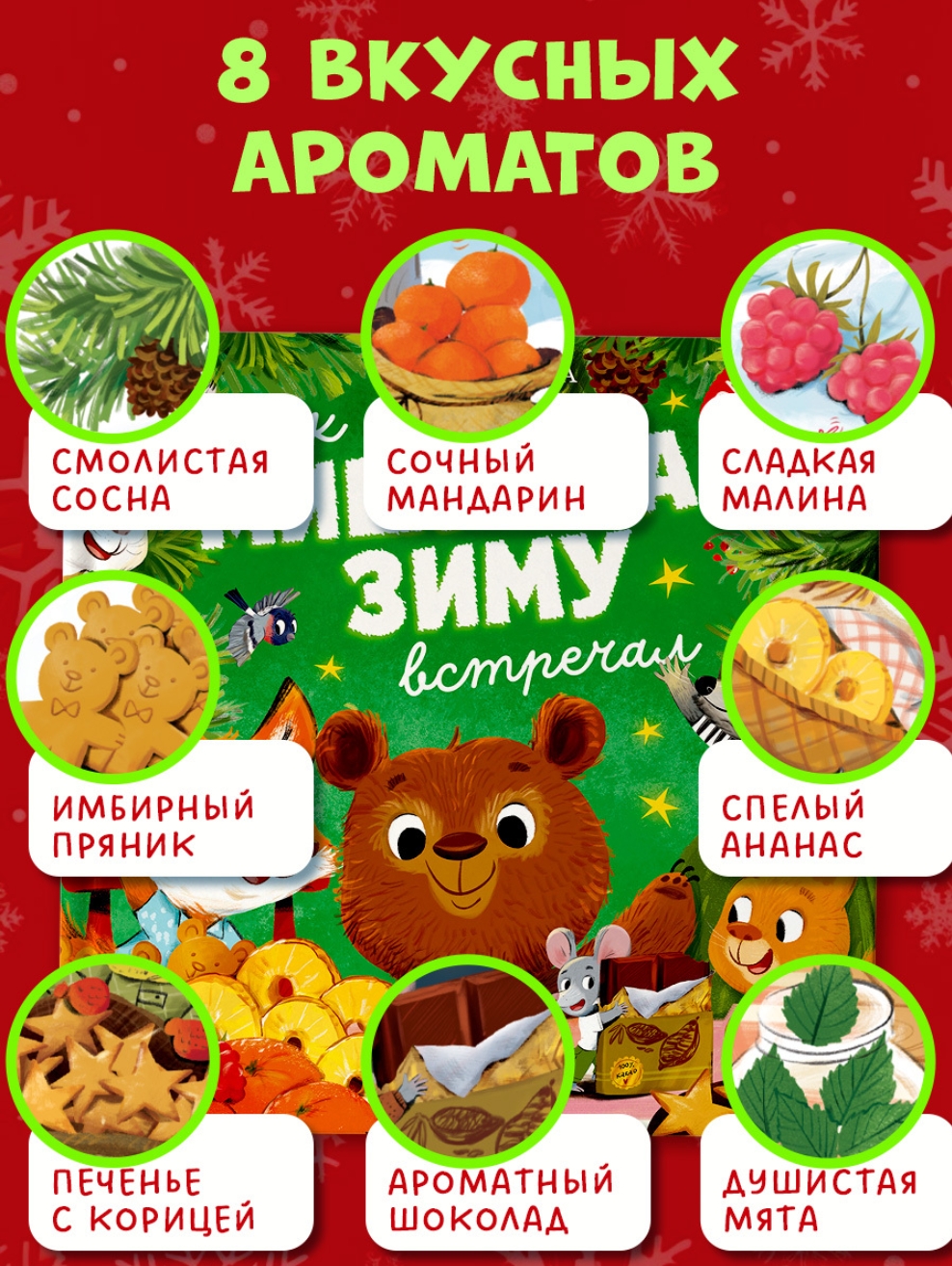 В книге 8 страниц со вкусными запахами: смолистая сосна, сочный мандарин, сладкая малина, имбирный пряник, печенье с корицей, душистая мята, шоколад. Достаточно потереть страницу, чтобы почувствовать приятный аромат.
