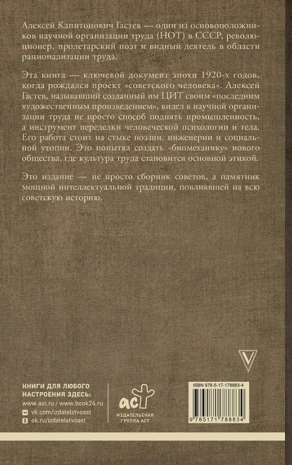 Эта книга — ключевой документ эпохи 1920-х годов, когда рождался проект «советского человека». Алексей Гастев, называвший созданный им ЦИТ своим «последним художественным произведением», видел в научной организации труда не просто способ поднять промышленность, а инструмент переделки человеческой психологии и тела. Его работа стоит на стыке поэзии, инженерии и социальной утопии. Это попытка создать «биомеханику» нового общества, где культура труда становится основной этикой.