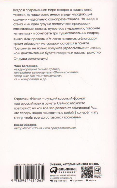 Даже те, кто хорошо говорит по-русски, иногда ошибаются в самых простых словах или забывают, как все-таки правильно: «афера» или «афёра», «помахай» или «помаши», кофе «на вынос» или «навынос». Медиа про воспитание и образование «Мел» уже много лет ведет рубрику «Грамотность», в которой просто и быстро разбирает сложные, неоднозначные, новые правила русского языка. А теперь знаменитые карточки «Мела» выходят в виде книги — впервые в истории. Глаголы, вымогающие у нас лишнюю букву, наречия, которые клянчат запятые, ударения, что норовят встать не туда, новые сленговые выражения и множество других удивительных историй про слова теперь собраны в издании, которое совсем не похоже на классический учебник или справочник по русскому языку. Хотя бы потому, что написана эта книга еще и с иронией — читать ее будет не скучно, а правила, благодаря остроумным примерам, теперь уж точно запомнятся.