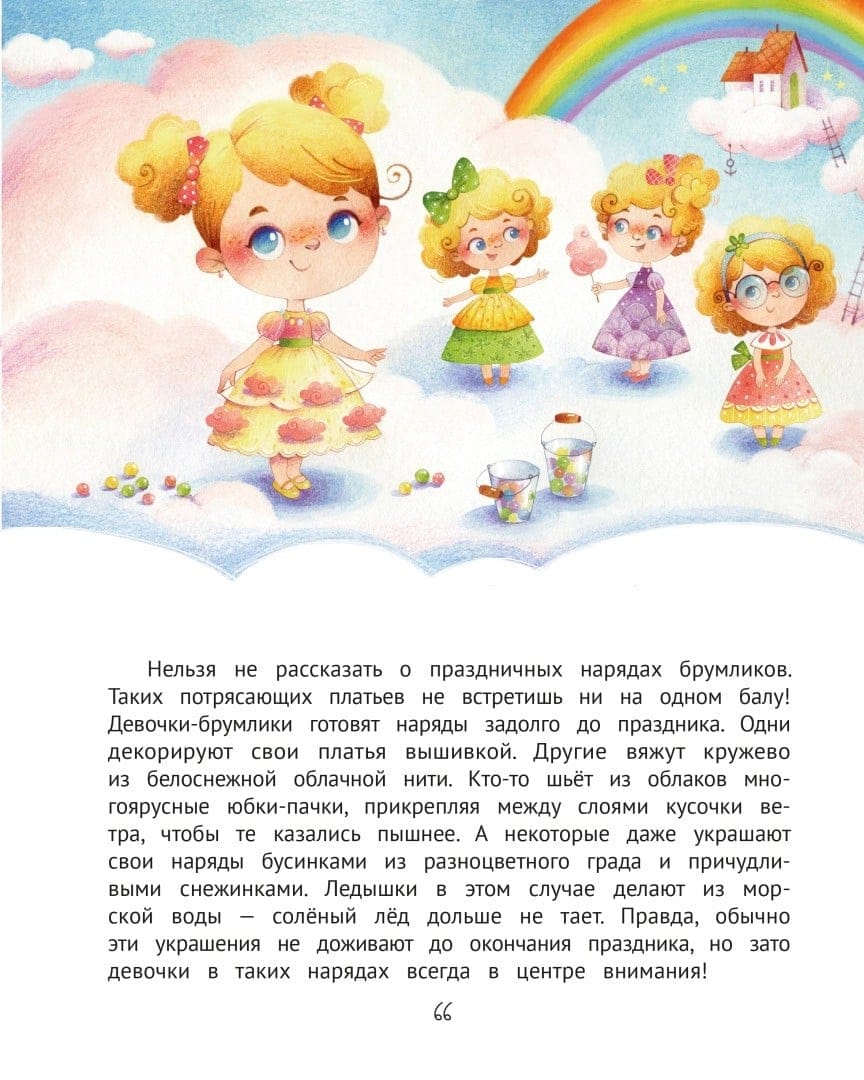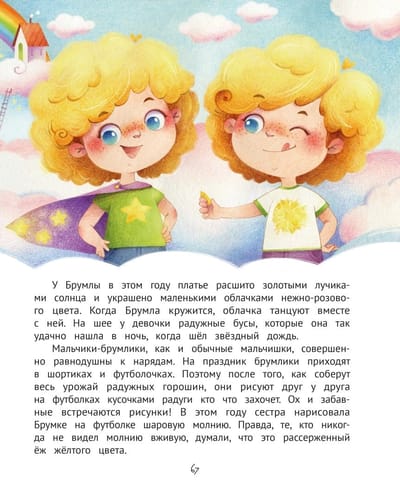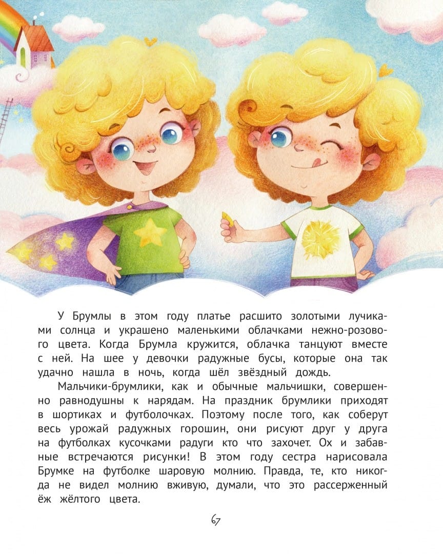 Брумка и Брумла - обычные малыши, которые любят играть, бегать, шалить и обниматься с родителями. Или не совсем обычные?.. Ведь они живут на облаках, едят кашу с кусочками радуги, летают на воздушных змеях, выращивают солнечные лучи и любуются звёздочками в аквариумах!
