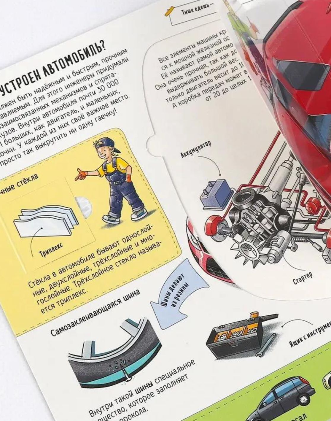 Книжка с окошками «Как устроен автомобиль» в увлекательной форме расскажет юному читателю о машинах-помощниках, которые сопровождают нас каждый день. С её помощью ребёнок выяснит, из чего состоят автомобили, как их производят, обслуживают и ремонтируют, какими они бывают и как они появились.