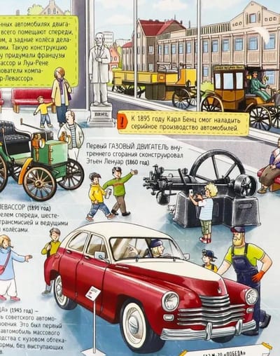 Подробные красочные иллюстрации и окошки разной формы позволят малышу изучить этапы сборки автомобиля, как в настоящем музее рассматривать первые машины и узнать много другой интересной и полезной информации.