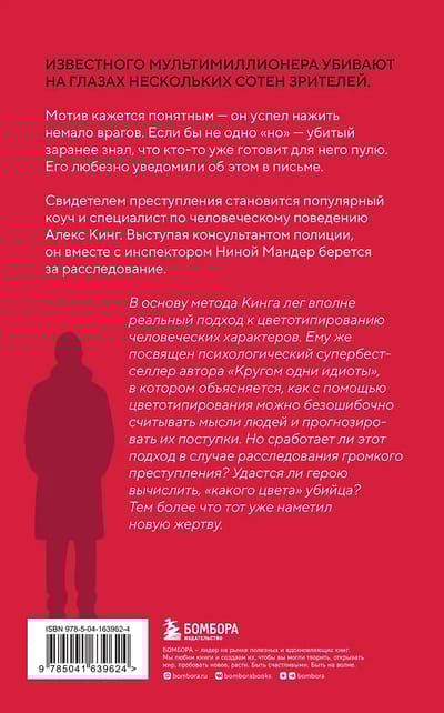 В основу метода Кинга лег вполне реальный подход к цветотипированию человеческих характеров. Ему же посвящён психологический супербестселлер автора «Кругом одни идиоты», в котором объясняется, как с помощью цветотипирования можно безошибочно считывать мысли людей и прогнозировать их поступки. Но сработает ли этот подход в случае расследования громкого преступления? Удастся ли герою вычислить, «какого цвета» убийца? Тем более что тот уже наметил новую жертву.