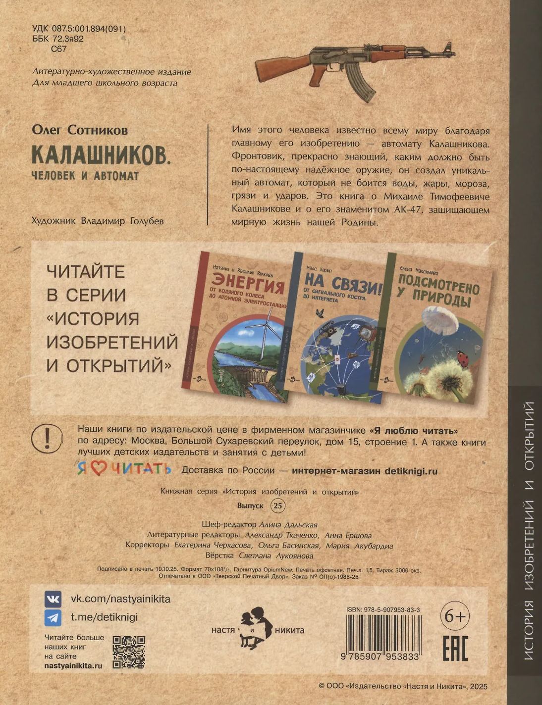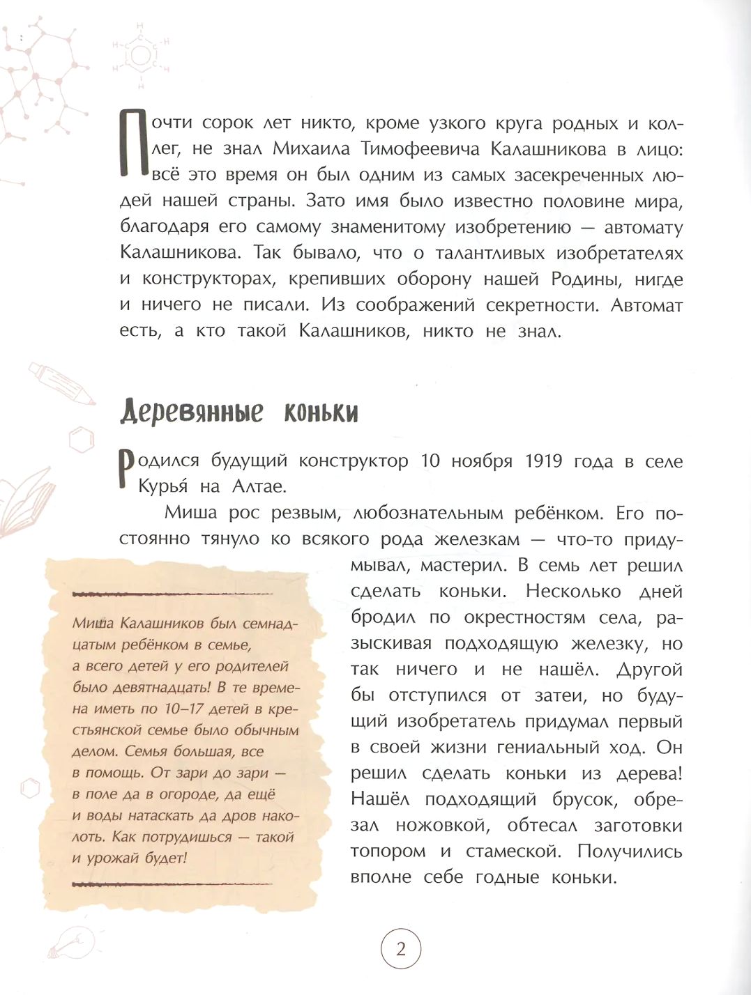 Имя этого человека известно всему миру благодаря главному его изобретению — автомату Калашникова. Фронтовик, прекрасно знающий, каким должно быть по-настоящему надёжное оружие, он создал уникальный автомат, который не боится воды, жары, мороза, грязи и ударов. Это книга о Михаиле Тимофеевиче Калашникове и о его знаменитом АК-47, защищающем мирную жизнь России.
