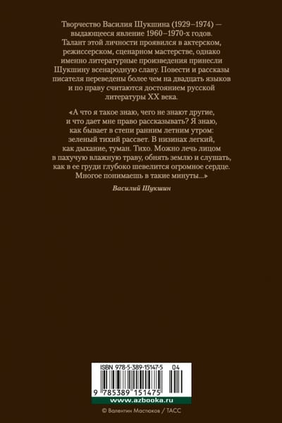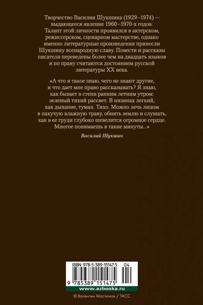 Творчество Василия Шукшина (1929–1974) – выдающееся явление 1960–1970-х годов. Талант этой личности проявился в актерском, режиссерском, сценарном мастерстве, однако именно литературные произведения принесли Шукшину всенародную славу. Повести и рассказы писателя переведены более чем на двадцать языков и по праву считаются достоянием русской литературы ХХ века.