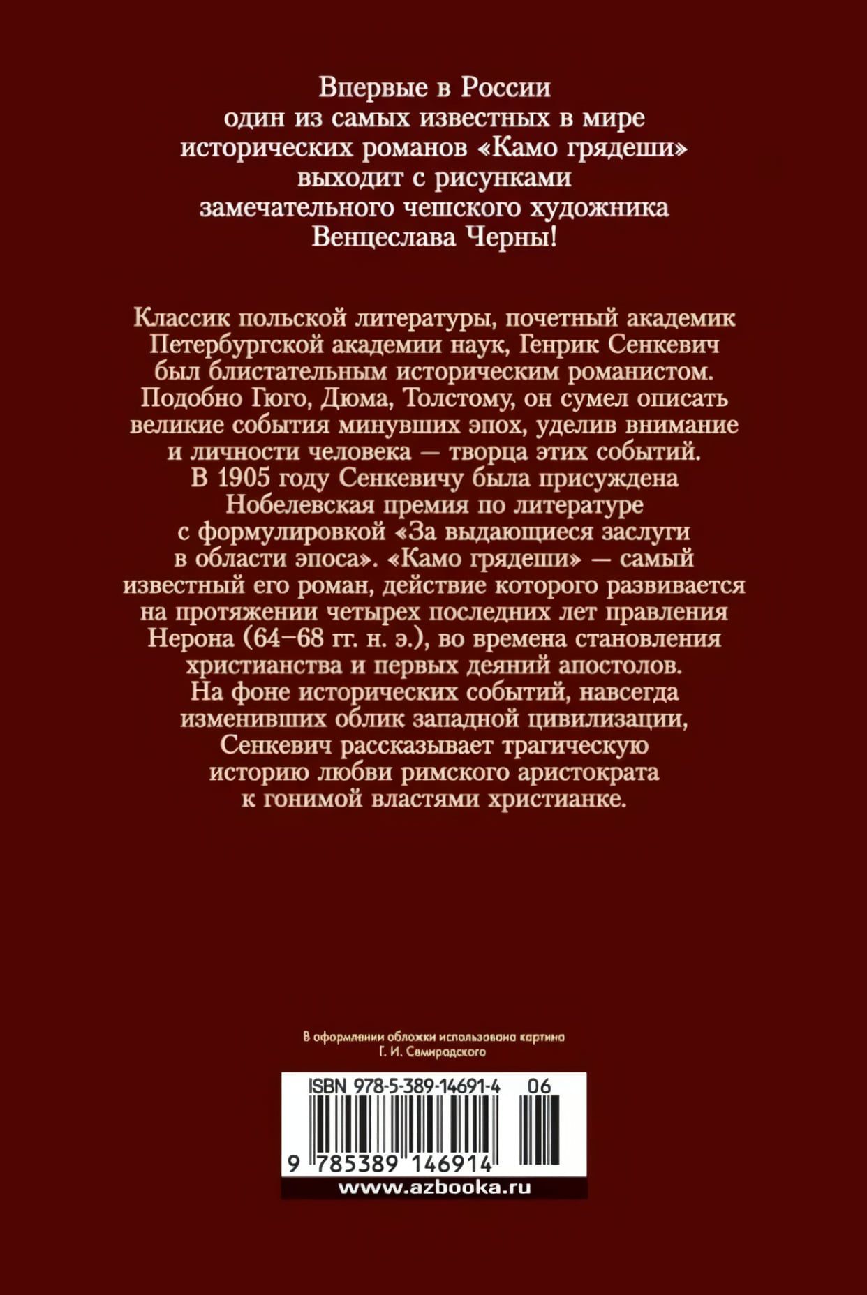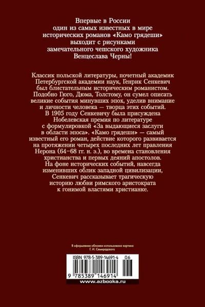 Классик польской литературы, почетный академик Петербургской академии наук, Генрик Сенкевич был блистательным историческим романистом. Подобно Гюго, Дюма, Толстому, он сумел описать великие события минувших эпох, уделив внимание и личности человека - творца этих событий. В 1905 году Сенкевичу была присуждена Нобелевская премия по литературе с формулировкой «За выдающиеся заслуги в области эпоса». «Камо грядеши» – самый известный его роман, действие которого развивается на протяжении четырех последних лет правления Нерона (64 - 68 гг. н.э.), во времена становления христианства и первых деяний апостолов.