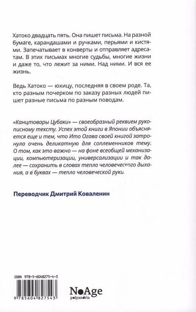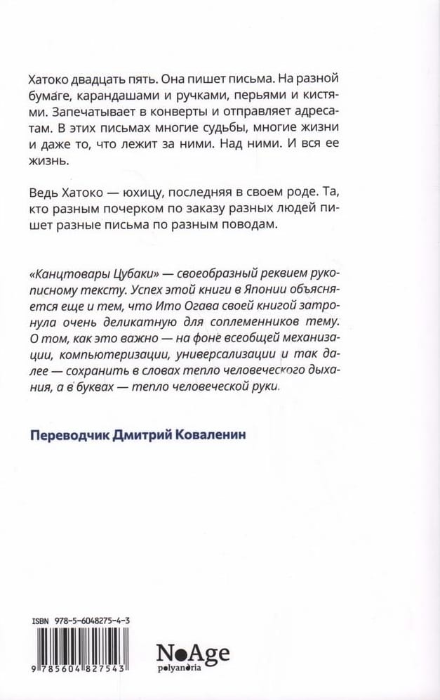 Хатоко двадцать пять. Она пишет письма. На разной бумаге, карандашами и ручками, перьями и кистями. Запечатывает в конверты и отправляет адресатам. В этих письмах многие судьбы, многие жизни и даже то, что лежит за ними. Над ними. И вся ее жизнь.  Ведь Хатоко — юхицу, последняя в своем роде. Та, кто разным почерком по заказу разных людей пишет разные письма по разным поводам.  «Канцтовары Цубаки» — своеобразный реквием рукописному тексту. Успех этой книги в Японии объясняется еще и тем, что Ито Огава своей книгой затронула очень деликатную для соплеменников тему. О том, как это важно — на фоне всеобщей механизации, компьютеризации, универсализации и так далее — сохранить в словах тепло человеческого дыхания, а в буквах — тепло человеческой руки. Переводчик Дмитрий Коваленин  Хатоко двадцать пять. Она пишет письма. На разной бумаге, карандашами и ручками, перьями и кистями. Запечатывает в конверты и отправляет адресатам. В этих письмах многие судьбы, многие жизни и даже то, что лежит за ними. Над ними. И вся ее жизнь.  Ведь Хатоко — юхицу, последняя в своем роде. Та, кто разным почерком по заказу разных людей пишет разные письма по разным поводам.  «Канцтовары Цубаки» — своеобразный реквием рукописному тексту. Успех этой книги в Японии объясняется еще и тем, что Ито Огава своей книгой затронула очень деликатную для соплеменников тему. О том, как это важно — на фоне всеобщей механизации, компьютеризации, универсализации и так далее — сохранить в словах тепло человеческого дыхания, а в буквах — тепло человеческой руки.