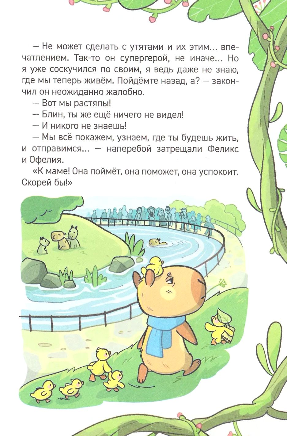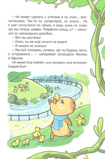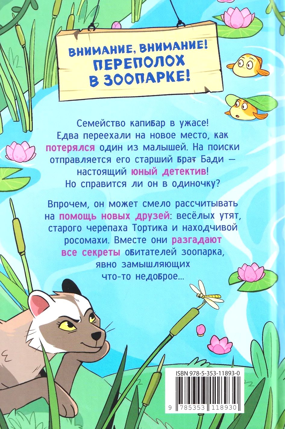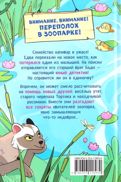 Внимание, внимание! Переполох в зоопарке: семейство капибар в ужасе! Едва переехали на новое место, как потерялся один из малышей. На поиски отправляется его старший брат Бади – настоящий юный детектив! Но справится ли он в одиночку? Впрочем, он может смело рассчитывать на помощь новых друзей: веселых утят, мудрого черепаха Тортика и находчивой росомахи. Вместе они точно разгадают все секреты зоопарка и его обитателей!