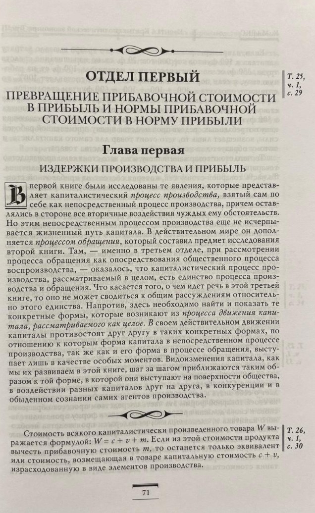 При работе над изданием был учтен опыт как классических советских изданий, так и последнего немецкого издания в рамках международного проекта MEGA. Текст III тома публикуется с уточненным переводом ряда мест и комментариями, очищенными от тенденциозных оценок прежних лет. В приложении публикуются фрагменты из «Теорий прибавочной стоимости», посвященные анализу теорий ренты и издержек производства Д. Рикардо, а также соответствующий проблематике III тома фрагмент главы о капитале из «Грундриссе». Текст III тома сопровожден двойной пагинацией на полях, а также указателем имен, уточненным по последнему немецкому изданию.